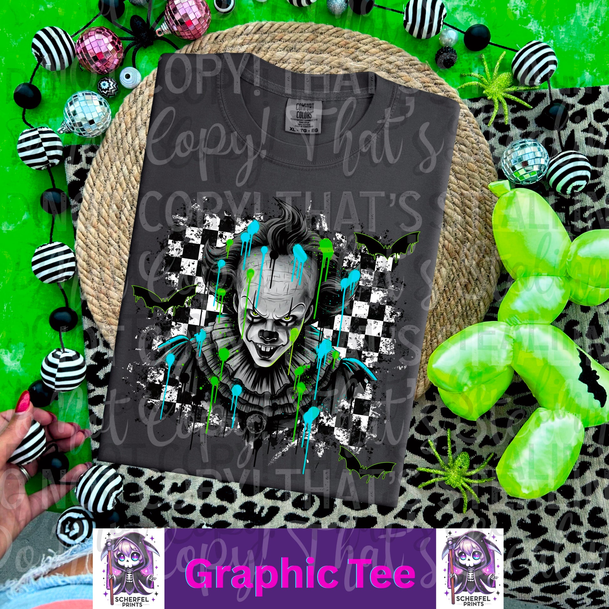 He’s got the grin, the drip, and the nerve to haunt your closet. This bold design features a chaotic clown face set against a distressed checkerboard backdrop, with splashes of neon green and blue, creepy bats, and just enough nightmare fuel to keep things interesting.