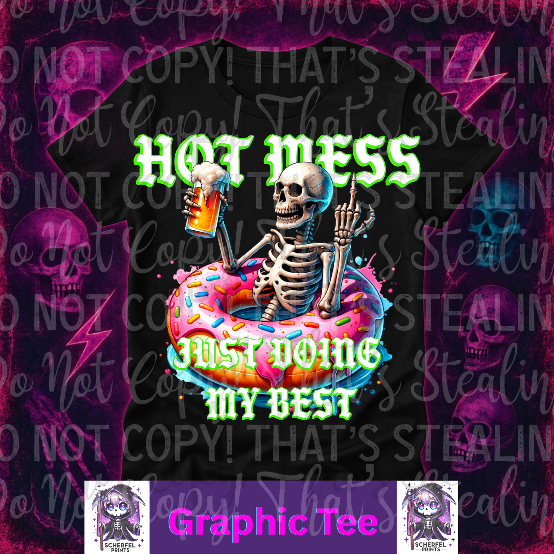 This tee is for the ones who are barely holding it together but still show up with caffeine, middle fingers, and sprinkle-covered floaties. Featuring a skeleton living their best afterlife, beer in hand and attitude on lock — this is your go-to uniform for surviving the mess with style.