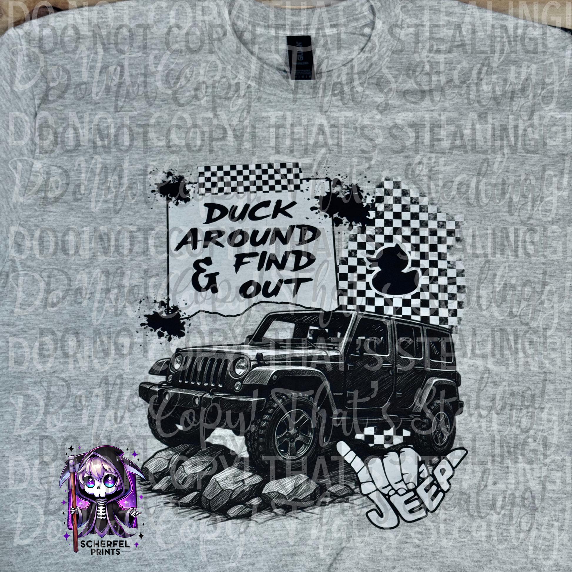 This edgy graphic tee is built for off-road rebels and duck collectors alike. Featuring a gnarly Jeep scaling rocks, checkerboard grunge, and that iconic hand sign—this shirt sends one clear message: mess around and you just might get ducked.