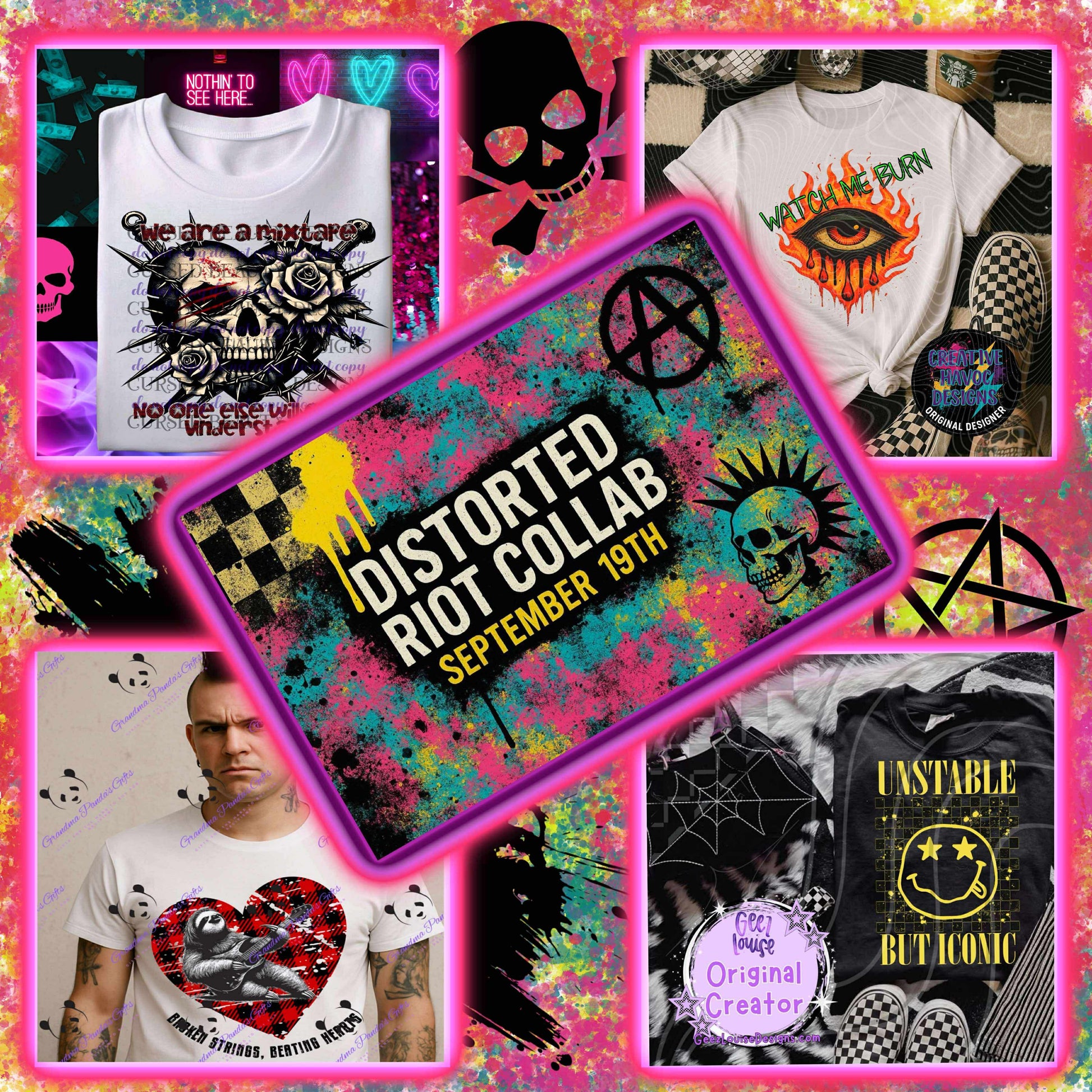 The Distorted Riot Collab is a limited-edition collection featuring over 40 high-res PNG designs from 9 underground creators. Each piece blends alt, emo, grunge, and glitchcore aesthetics—perfect for digital layering, print-on-demand, or injecting raw energy into your creative projects.