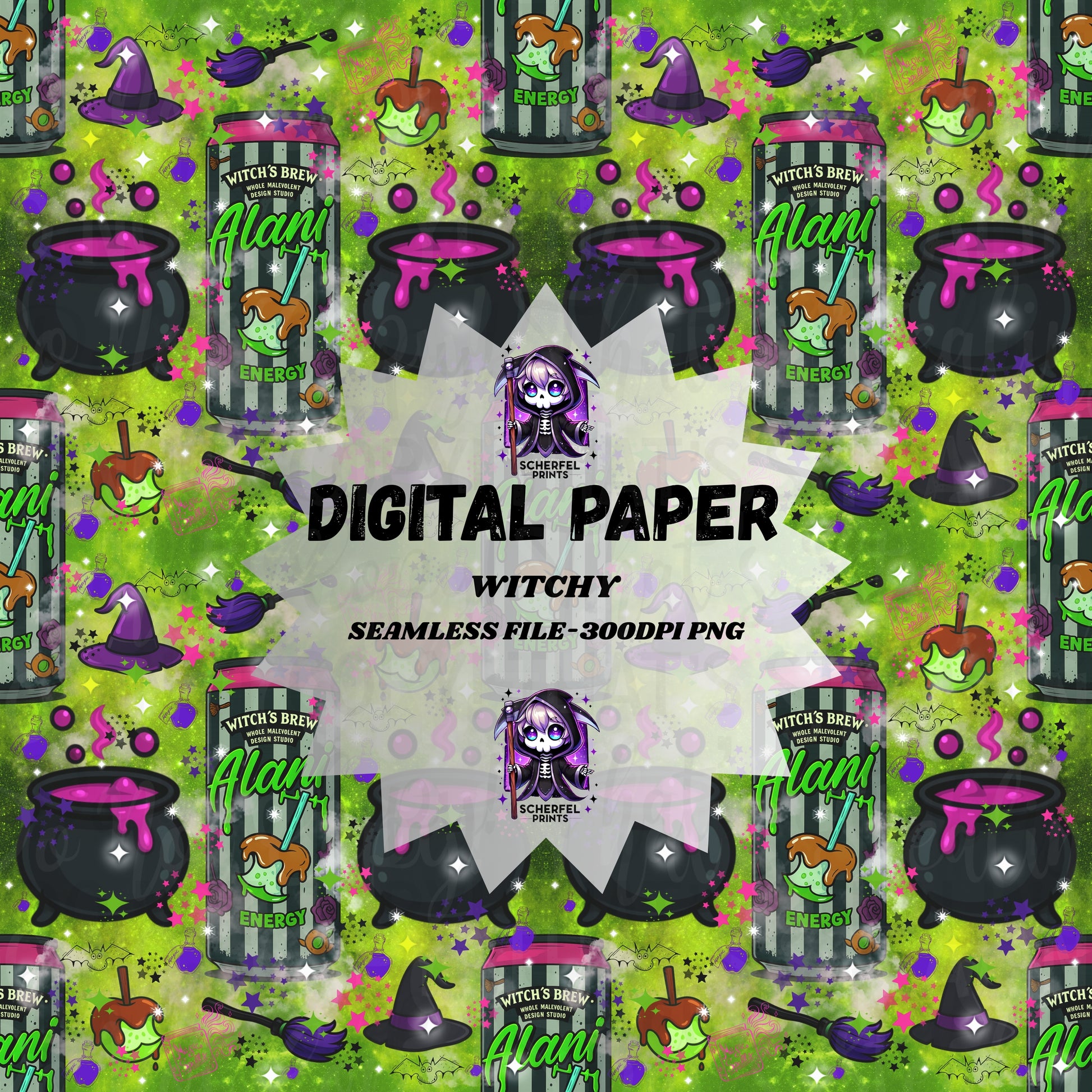 Double, double, caffeine and trouble! This Witchy digital paper brews up the perfect potion of spooky and sass. Featuring witch hats, bubbling cauldrons, poisoned caramel apples, and “Witch’s Brew” energy drinks, it’s a must-have backdrop for your Halloween and horror-core designs.