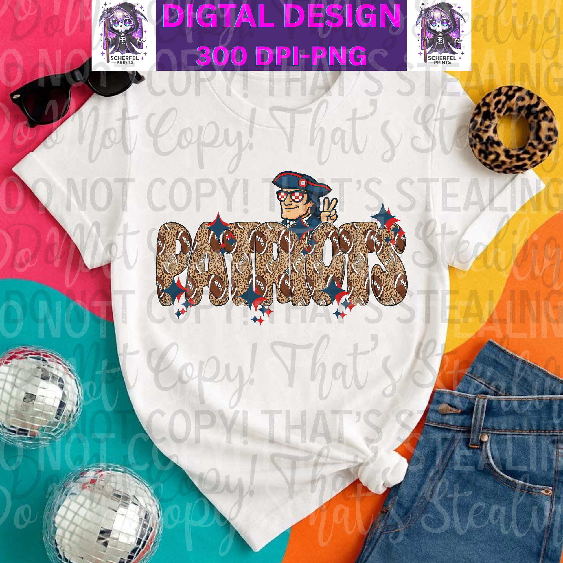 Bring team spirit with a splash of wild style! This high-resolution PNG features bold "PATRIOTS" lettering in leopard print and a peace-sign cartoon character that screams playful pride.