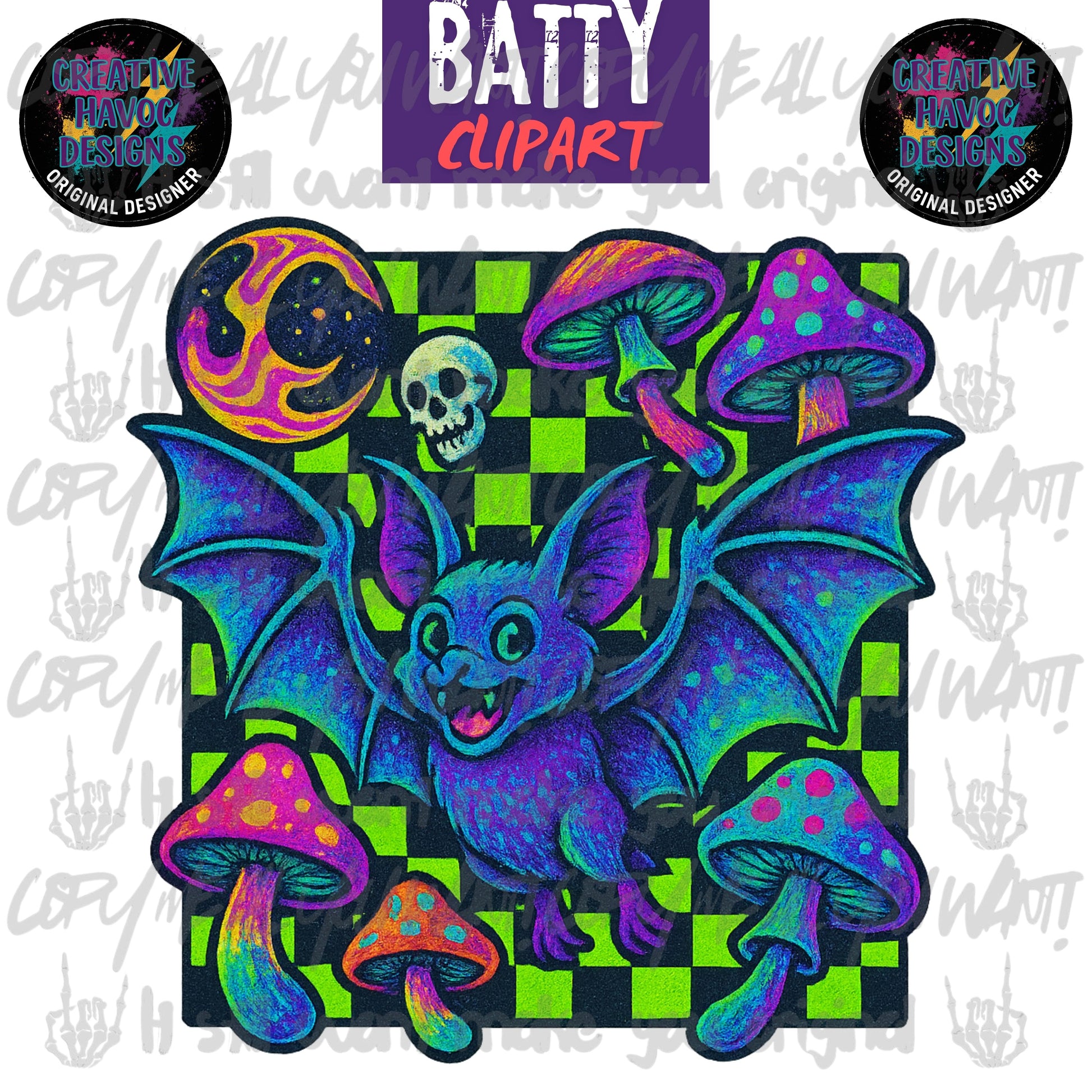Add a bold pop of chaos to your Halloween projects with this exclusive Creative Havoc Designs original! This glowing neon clipart features a happy bat surrounded by trippy mushrooms, a fiery planet, and a skull ā all set on a checkered backdrop. Perfect for sublimation, merch, stickers, and anything that needs a mix of creepy and cute.