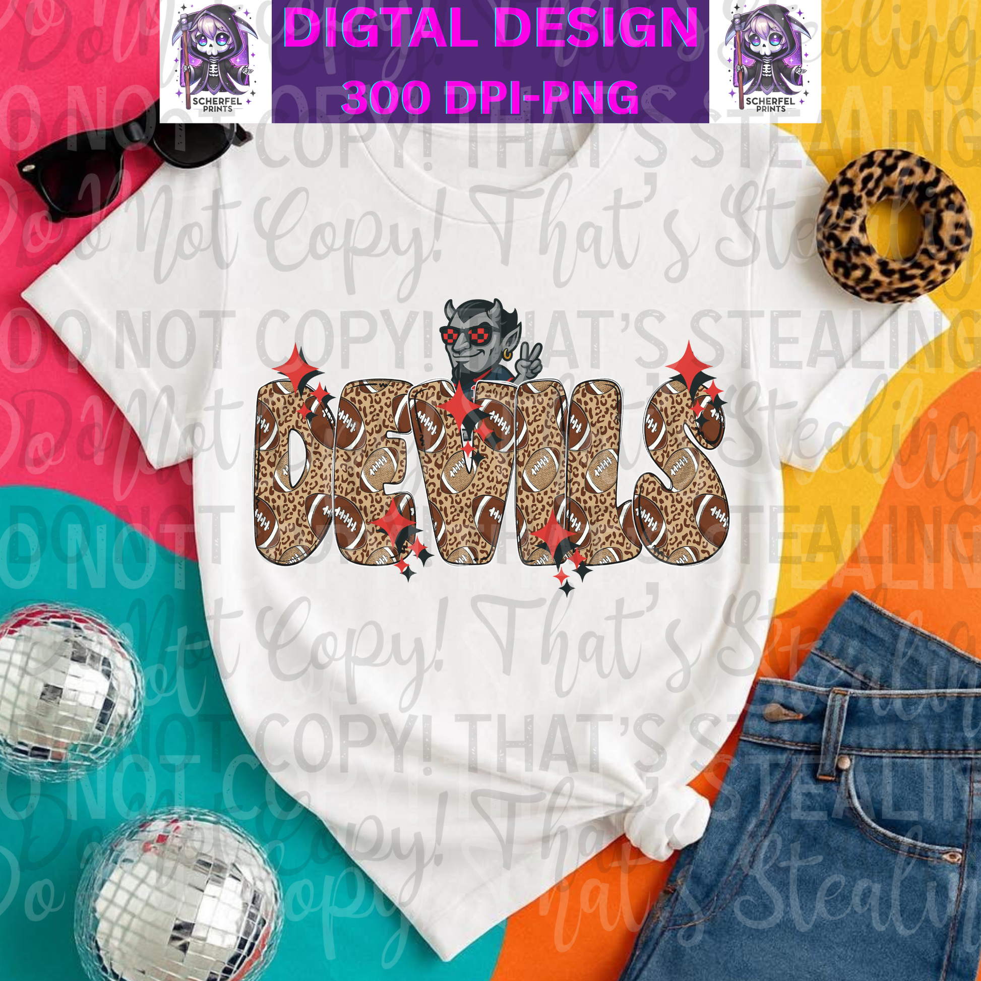Bring some fierce attitude to your game day gear with this bold and fun "Devils" PNG design! Featuring a unique blend of leopard print and football pattern, the chunky retro-style letters scream team spirit with a wild twist. At the top, a mischievous, cool devil character flashes a peace sign, rocking pixelated sunglasses and a confident smirk — the ultimate symbol of edgy team pride. Red and black sparkles add extra flair, making this design pop with energy.