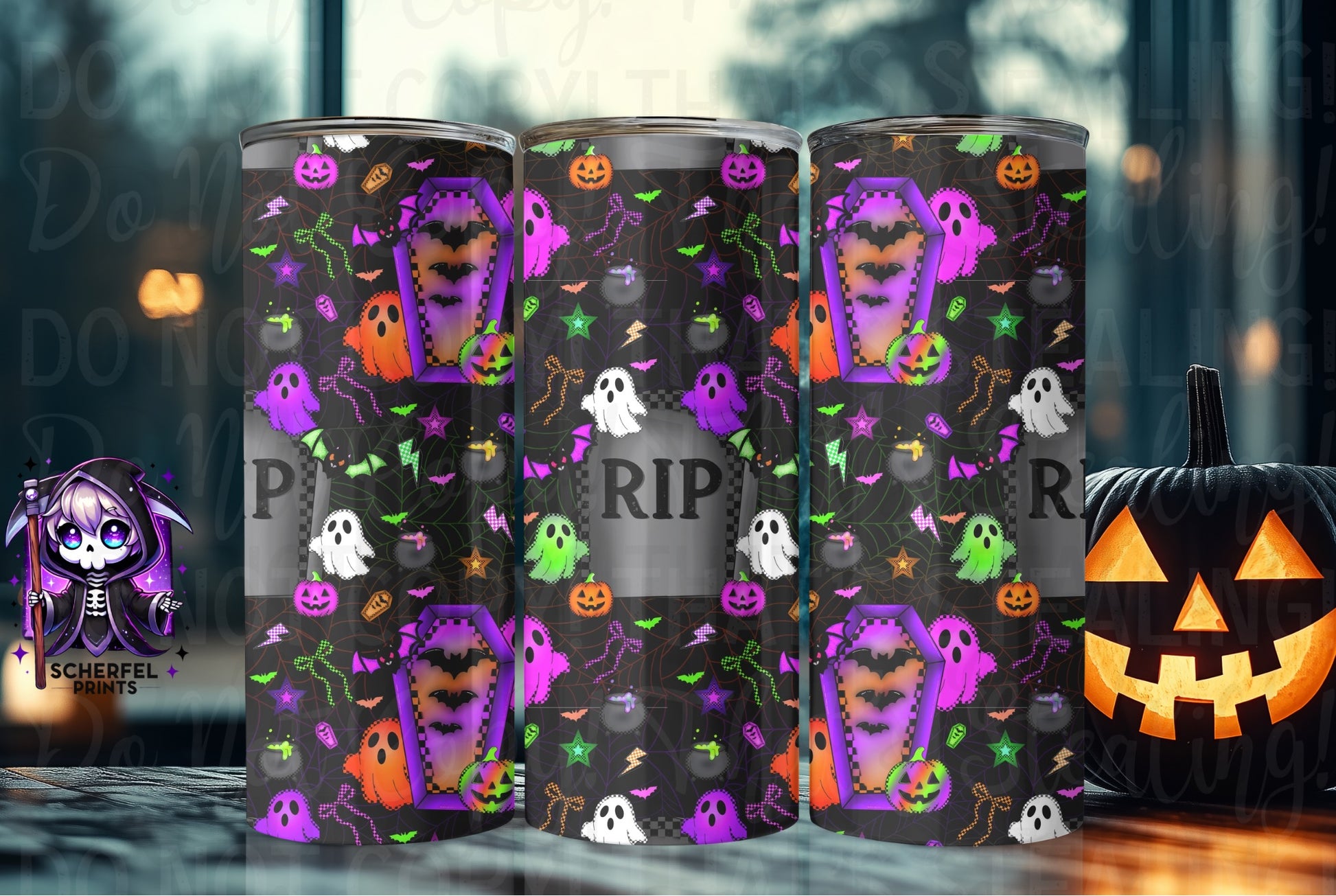 Creepy meets cute in full checkered chaos. This tumbler wraps classic Halloween icons—ghosts, coffins, bones, bats, and “RIP” flair—into a bold black-and-white checkered pattern with pops of purple, green, orange, and white. It’s spooky season in full throttle, perfect for sipping something sinister or sweet.